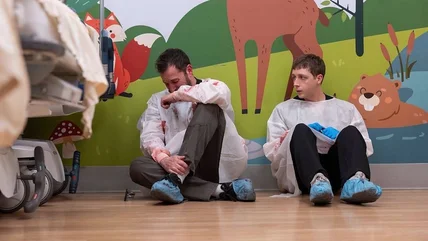 The penultimate hour expands Robby's personal history with the introduction of his ex-girlfriend Janey, played by Sarah Jane Morris — who, in real life, is married to Ned Brower, aka Nurse Jesse. For Wyle, bringing Jake's mother into the story at this point provided a necessary outside perspective on Robby: someone who knows him beyond the walls of Pittsburgh Trauma Medical Center, and who understands both his self-blame and his tendency toward shame spirals.