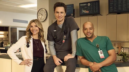 In the first episode back, J.D. (Zach Braff) — who had been working as a concierge doctor so he could spend more time with his kids — found himself pulled back into Sacred Heart when one of his patients was admitted, a return that quickly became something more permanent. Inside those familiar halls, he was reunited with Turk (Donald Faison) and Carla (Judy Reyes), who are still going strong 25 years later and now share four daughters; Elliot (Sarah Chalke), from whom he is now divorced; and longtime mentor Dr. Cox (John C. McGinley), who stepped down at the end of Episode 1 and tapped J.D. to succeed him as chief of medicine.