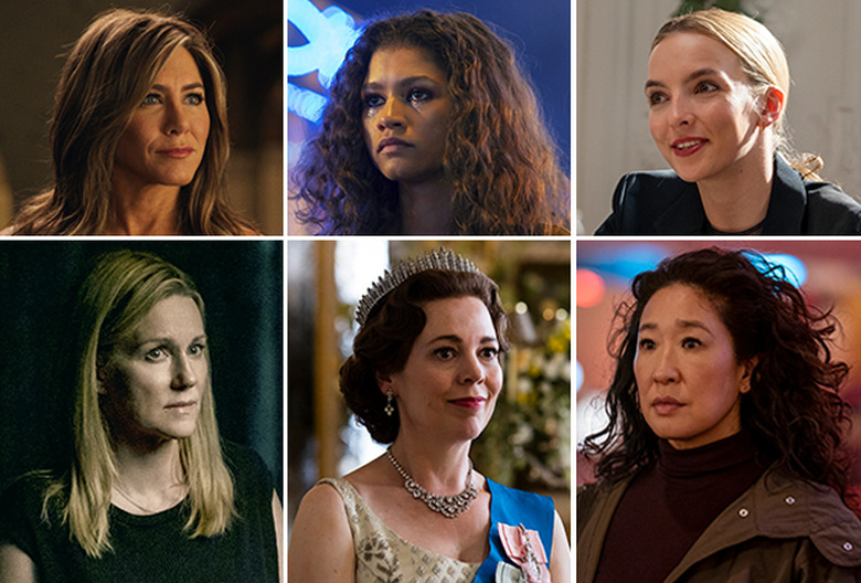 Killing Eve star Jodie Comer, who plays glamorous killer-for-hire Villanelle on the BBC America thriller, won the Emmy in this category last year, and she's back for the second straight time this year. But five other actresses are eager to knock her off her perch, including her co-star Sandra Oh, who's up for the third straight year for playing investigator Eve Polastri. Plus, she's up against two former Emmy winners: Jennifer Aniston, who's nominated for playing conflicted TV host Alex Levy on Apple TV+'s The Morning Show; and Laura Linney, back in the mix for the second straight year as Ozark's Wendy Byrde.