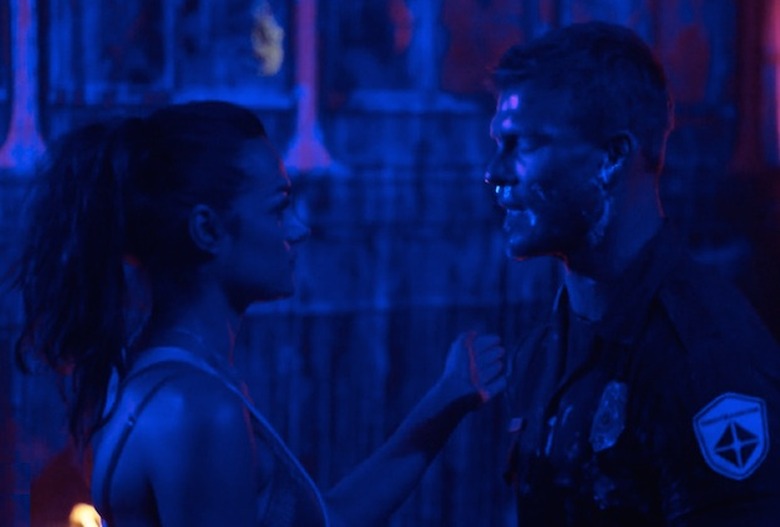 Grace (Christina Ochoa) puts knee to Arthur's (Alan Ritchson) jewels to keep her "sex zombie" partner focused