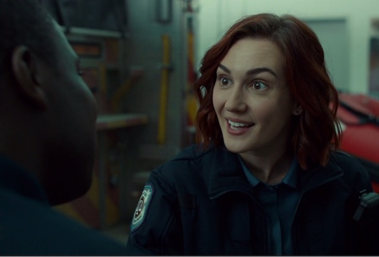 Nicole (Katherine Barrell) doesn't have the heart to tell a fireman he's climbing up to the wrong window