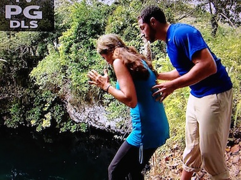 Question: Is Chase gently stroking Ali's back to calm her fears about jumping off a cliff, or is he about to give her a taste of Marines-style tough love and push her to victory?