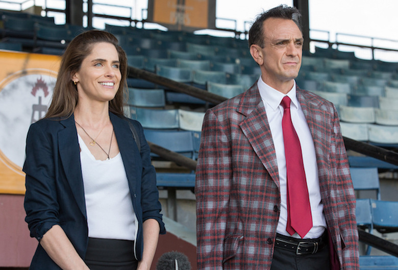 On the IFC comedy, the Studio 60 and Togetherness standout plays Jules, the owner of a minor-league baseball team who hires (and subsequently falls for) disgraced MLB announcer Jim Brockmire (played by man-of-a-million-voices Hank Azaria). After revealing to the title character that she was pregnant with his child at the end of Episode 5, Wednesday's half-hour (airing at 10/9c) finds Jules and Brockmire mulling over whether they want to have the child, or whether she should have an abortion.