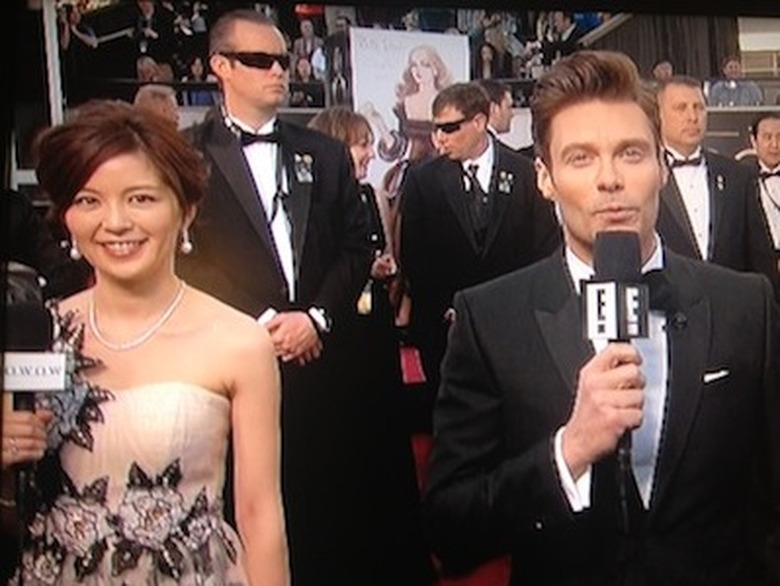 We're not certain about the identity of the journalist who "accidentally" found her way into Ryan Seacrest's opening shot on the E!'s Live From the Red Carpet: 2013, but we appreciate that she resisted the urge to shout, "Look mom, I'm on TV!"