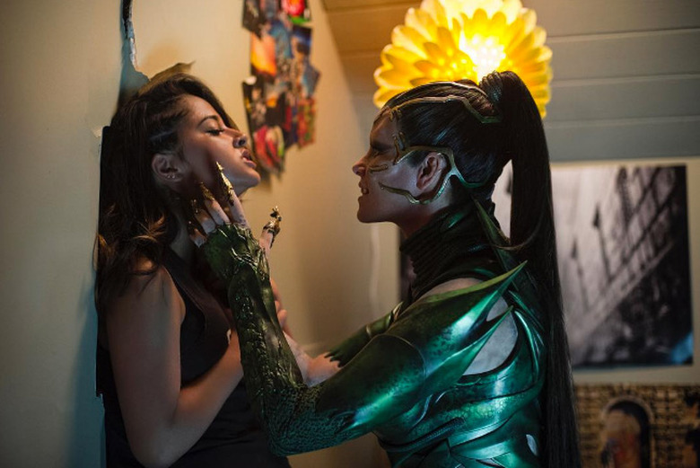 Becky G as Trini (Yellow Ranger) and Elizabeth Banks as Rita Repulsa