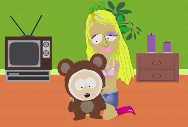 Remember Paris Hilton? It seems like a long time since she mattered, but back in Season 8, South Park mercilessly skewered her, wonky eye and all. In town to promote her new fragrance "Skanque," Paris was so insufferable that her pet chihuahua blew its brains out to get away from her. But don't worry: She found a new pet in Butters!