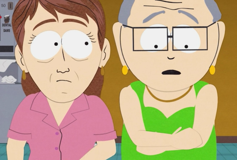 "Scissor me timbers!" If you know of any method that can bleach the image of newly declared lesbian Mrs. Garrison and her girlfriend scissoring (not pictured here, for decency's sake) out of our brains, let us know. We'd pay good money.