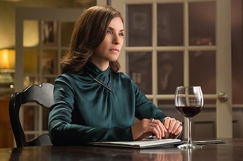 Whether mourning ex-lover Will's death by mainlining martinis, throwing back tequila shots with new pal Finn or glug-glug-glugging a goblet of red in the comfort of her living room (to watch AMC's Darkness at Noon, natch), Alicia isn't afraid to use an adult beverage to combat the stresses of being a mom, a law partner and the first lady of Illinois. Sure, she almost got into hot water when a shady cop — clearly working for her opponent in the race for State's Attorney — pulled over her car on the way home from the bar, but she'd only had one glass. Nope, Alicia doesn't treat alcohol like it's Pringles: Once she pops, she can (and sometimes will) stop.