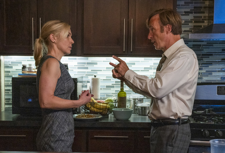 Jimmy and Kim are still reeling from their close encounter with Lalo last week; they watch him drive off, and Jimmy runs to the phone where Mike was listening. ("I heard enough to know she saved your ass," Mike grumbles.) When Kim asks who that is on the phone, Jimmy spills the whole truth to her about what happened out there in the desert. But she doesn't judge him, and they check into a swanky hotel for their protection. As she's washing up, he works up the courage to ask her: "Am I bad for you?" She reassures him he's not; he did "cross the line," she allows, but she trusts he won't do it again. He's still worried, though.
