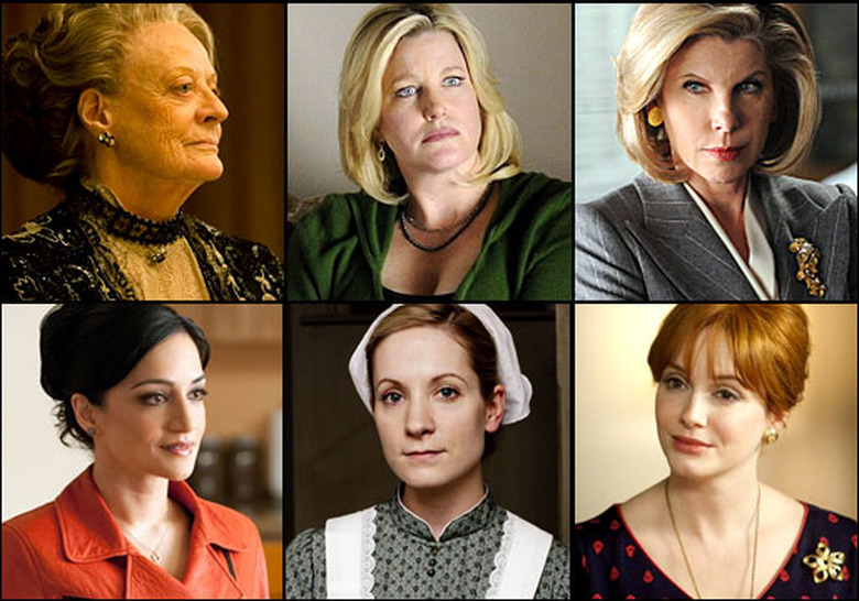 The Good Wife's Archie Panjabi, for instance, took home the prize for Outstanding Supporting Actress in a Drama Series two years ago, while her costar Christine Baranski (a 10-time nominee) was an Emmy winner back in 1995 (as Outstanding Supporting Actress in a Comedy Series for Cybill). And then there's six-time nominee Maggie Smith of Downton Abbey, who's looking for a hat trick to go along with her wins in 2003 (Outstanding Lead Actress in a Miniseries or a Movie for My House in Umbria) and 2011 (as Outstanding Supporting Actress in a Miniseries or Movie, also for Downton).