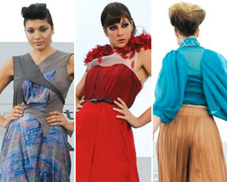 * I'll say this much for Nina, Michael, Heidi, and that chick who does ads for Skechers Shape-Ups, they made the right choice giving the win to Laura and Anthony's chic red number (pictured, center). The feathery shoulder pads were a nice touch, to be sure, but the trump card was that sensational flow of the skirt as it billowed in the wind. The only way the look could've made me more excited would've been if a particularly strong gust had created a parachute effect and swept Laura and Anthony's model into the Manhattan skyline.