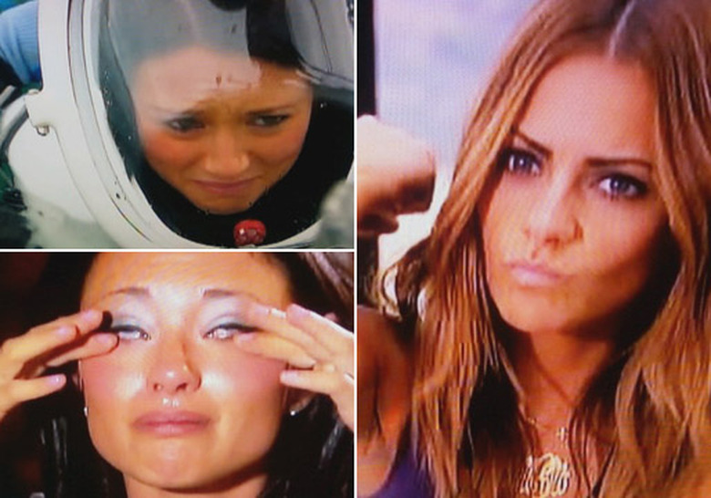 Take Brad's "romantic" one-on-one with Chantal O (top left, in helmet, and bottom, crying), which he ludicrously said he hoped would make her feel like she was experiencing something "completely out of the real world." (Because, of course, Chantal needed a beak from the totally real-world existence of being cooped up in a mansion with 25 perpetually intoxicated she-beasts and competing with them for the love of a dull man.) After a quick helicopter ride to Catalina Island, Brad told Chantal that she needed to don what looked like an underwater moon suit, leap over the side of a boat, and explore the ocean floor.