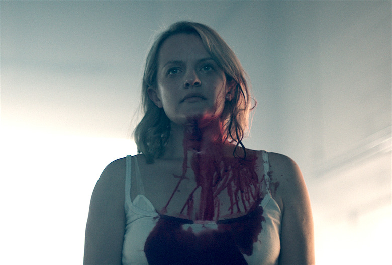Fresh off big wins at the Golden Globes and the Critics' Choice Awards, Hulu's dystopian drama is gearing up for its sophomore run, and these first-look photos give us a glimpse of what's next for Offred (Emmy winner Elisabeth Moss) and her fellow handmaids. Last we saw Offred, she was pregnant and being hauled away in a Gilead van for defying Aunt Lydia's orders... but from the looks of the photo above, which shows Offred drenched in blood and wearing a defiant stare, she's not going away without a fight.
