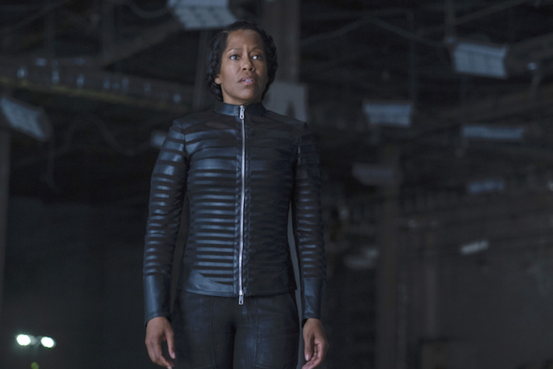 CYCLOPS BE GONE | Then Angela shows up and says that whatever Keane thinks will happen won't, because Lady Trieu's been planning much longer and way smarter than they ever could. But Keane doesn't care, and so he gets into some sort of chamber adjacent to the cage. Once he's locked in, a Kavalry member flips a switch... and then there's some sort of blast that makes Angela's ears ring. Everyone is kind of out of it, and Looking Glass rips off his mask to vomit on the floor. Trieu's centrifuge is hovering over the cage, and I had to rewind the ep to make sure I was seeing correctly, but yes: Trieu has transported the cage, the Cyclops members and Angela, Laurie and Looking Glass outside to where the newsstand is. "I'm fulfilling my promise to your grandfather," Trieu tells Angela when she and her team arrive. "He gave me your husband, and I'm giving him justice."