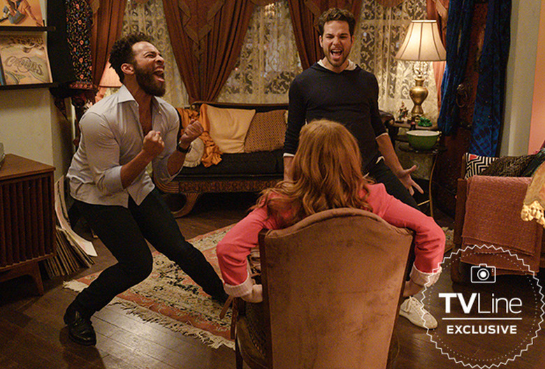In TVLine's exclusive photo from the NBC musical dramedy's Season 2 premiere (airing Tuesday, Jan. 5 at 8/7c), the two fellas passionately serenade Zoey (played by Jane Levy) with "Are You Gonna Be My Girl" by Jet. And plot twist: Romantic rivals Max (Skylar Astin) and Simon (John Clarence Stewart) are pals now!