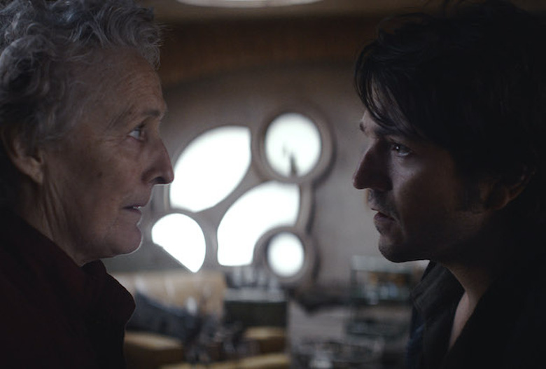 Cass slips Bix the 12K in credits he owes for past this and that, then slips back out into the night, dodging stormtrooper patrols. As he does so, he flashes back to his childhood, and seeing his father, Clem, draw a clone trooper patrol's attention. The troopers raise their rifles at the local man, but the memory doesn't connect the tragic dots we know to follow. Come morning, Cass returns home to learn that Maarva has no intention of packing up and leaving. "What's left to keep you here?" he asks; "The Rebellion," she answers. Maarva says that whereas she used to always avoid the square where Clem wound up hanged, she walked through it smiling, after hearing of the garrison robbery. "People are standing up, and there is work to be done," she explains. Maarva understands that Cassian cannot stay, just as much as she cannot leave. And that it's OK if he misses her, because that if, after all, love. And she has never loved anymore more than she loves her son. Maarva sends Cass on his way, but not before urging him to bail on his search for his sister: "There were no survivors" on Kenari, she asserts.