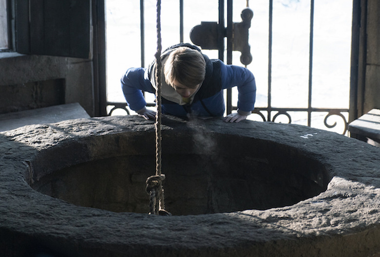 While Tyler and Kinsey explore a nearby cliff on the property (texting a selfie to their late dad's phone, for posterity sake), Bode discovers a wellhouse. Squeezing past its locked gate, the lad snaps a pic of the bottomless well, but loses the spat-out Polaroid to the ink-black chasm. Yet moments later, the Polaroid materializes on the well ledge! Bode hollers down into the hole, and is eventually answered by his "echo," a female voice who advises him to be on the lookout for magical keys hidden throughout his new home. Sure 'nuff, Bode soon after is cued by "whispers" to bust up Kinsey's prized bracelet — a gift from Dad she vowed to protect — and extract from it the Anywhere Key, which allows the user to walk through a door to any another door they have seen before. Kinsey is skeptical of Bode's claim, even when he waves around the ice cream he just procured from her "closet."