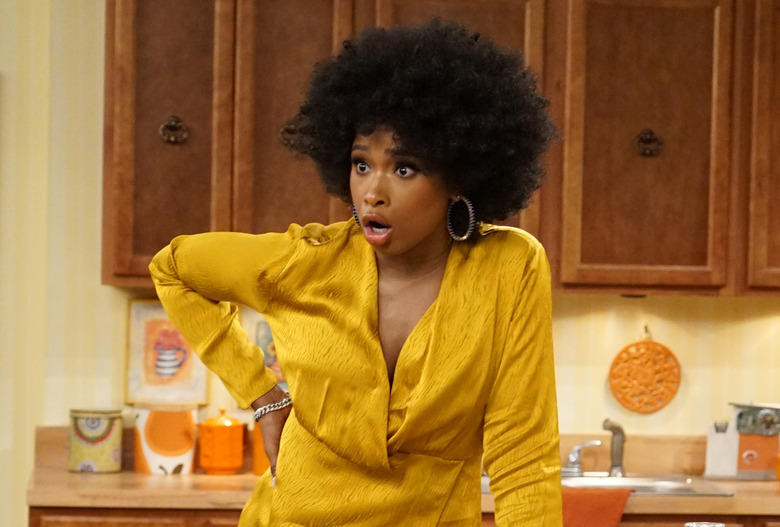 The Oscar-winning American Idol alum joined ABC's special Live in Front of a Studio Audience — a live staging of classic episodes of All in the Family and The Jeffersons — to belt out a live version of the classic "Movin' On Up" theme song that accompanied The Jeffersons during its original run. Wearing an Afro wig and a slinky '70s dress, Hudson strutted confidently through the Jeffersons set, crooning about moving into "a dee-luxe apartment in the sky." She was joined by a trio of backup singers for the second verse before nailing that famous final note in the hallway and then heading straight into the elevator.